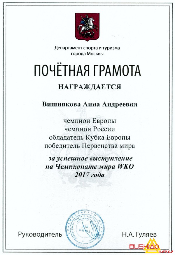 Все эти годы Анна тренируется в «Бусидо» под руководством Заслуженного тренера России сэнсея Белого Константина и двукратной чемпионки Мира, Заслуженного мастера спорта сэнсея Курбановой Зухры.