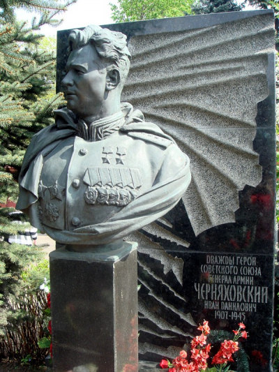 На памятнике он изображен молодым генералом армии, а на граните вместо эпитафии - список городов, освобожденных войсками под командованием Черняховского.
