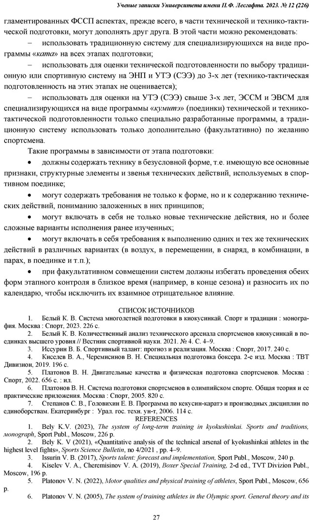 Белый, К.В. особенности этапности многолетней подготовки в киокусинкай / К.В. Белый // Ученые записки Университета имени П.Ф.Лесгафта. – 2023. – № 12 (Том 226). – С. 21-28. DOI: 10.34835/issn.2308-1961.2023.12.p21-28