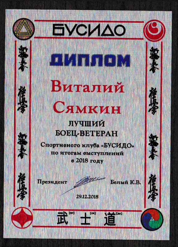 - Виталий Сямкин стал первым в клубе Чемпионом России среди ветеранов по Всестилевому каратэ (ИКО-4). Ранее чемпионами России среди ветеранов становились Александр Братчиков (ИКО-3 в 2014 году) и Сергей Ермишин (ВКО в 2017 году).