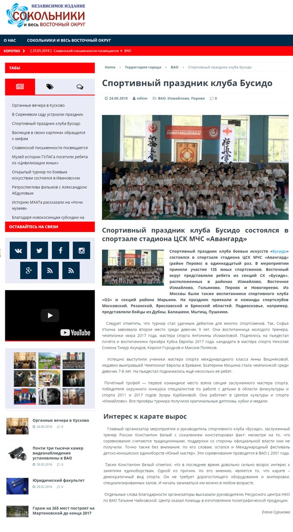 - Присвоены звания Кандидатов в мастера спорта по киокусинкай четырем спортсменам отделения «Бусидо-Синдо» (респ. Коми) - Авзаева Карина, Евстифеева Дарья, Гусев Александр, Голубев Михаил.