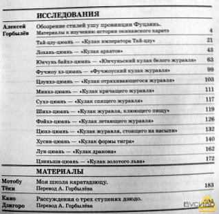 Особый интерес представляют методические указания по изучению и тренировке ката; ясно выраженные акценты в технике, иллюстрирующие безосновательность потуг отдельных исследователей наших дней, пытающихся дать новую интерпретацию технике каратэ, представленной в ката; указания о трех уровнях атаки и защиты в каратэ (дзёдан, тюдан, гэдан), которые по содержанию отличаются от современных; указания о применении техники каратэ в реальном бою. Статья крупнейшего знатока истории китайских ушу Ма Минда раскрывает историю становления техники и духовно-философской концепции системы Ма-ши Тунбэй уи. Профессор показывает зарождение принципов генерирования силы в приемах рукопашного боя в древнем искусстве стрельбы из самострела и лука, прослеживает развитие техники ударов «руками, проходящими насквозь», анализирует философские истоки Ма-ши Тунбэй уи.