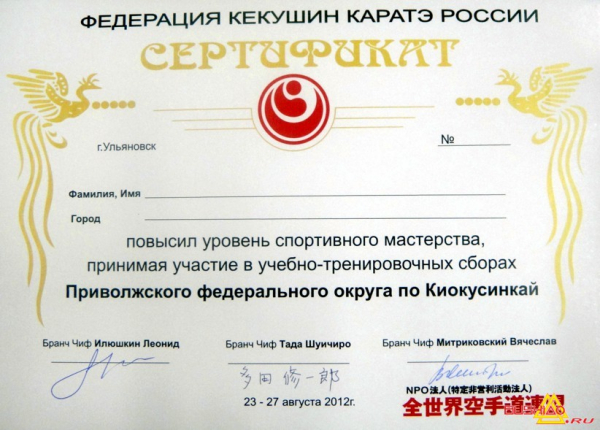 Сборы организованы бранч-чифами Поволжья Л.М.Илюшкиным (5 дан) и В.Митриковским (4 дан).