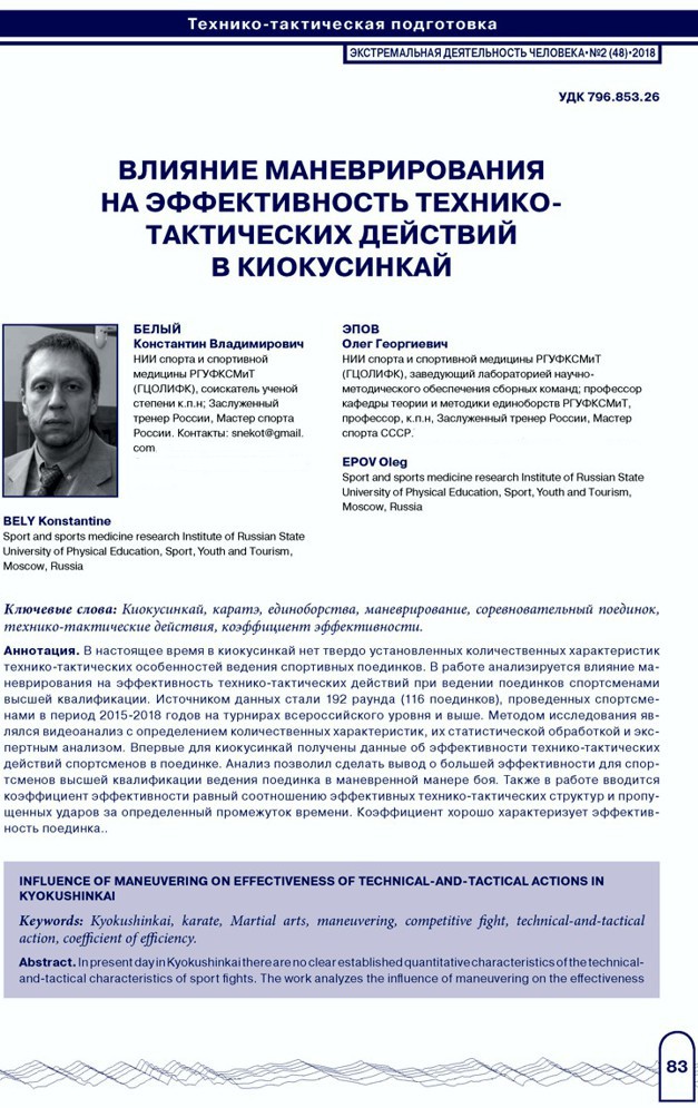 В настоящее время в киокусинкай нет твердо установленных количественных характеристик технико-тактических особенностей ведения спортивных поединков. В работе анализируется влияние маневрирования на эффективность технико-тактических действий при ведении поединков спортсменами высшей квалификации. Источником данных стали 192 раунда (116 поединков), проведенных спортсменами в период 2015-2018 годов на турнирах всероссийского уровня и выше. Методом исследования являлся видеоанализ с определением количественных характеристик, их статистической обработкой и экспертным анализом. Впервые для киокусинкай получены данные об эффективности технико-тактических действий спортсменов в поединке. Анализ позволил сделать вывод о большей эффективности для спортсменов высшей квалификации ведения поединка в маневренной манере боя. Также в работе вводится коэффициент эффективности равный соотношению эффективных технико-тактических структур и пропущенных ударов за определенный промежуток времени. Коэффициент хорошо характеризует эффективность поединка.